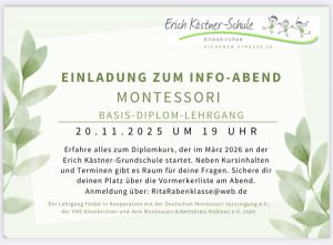 Erfahre alles zum Diplomkurs, der im März 2026 an der Erich Kästner-Grundschule startet. Neben Kursinhalten und Terminen gibt es Raum für deine Fragen. Sichere dir deinen Platz über die Vormerkerliste am Abend. Wir treffen uns im Klassenraum der Rabenklasse. Anmeldung über: RitaRabenklasse@web.de